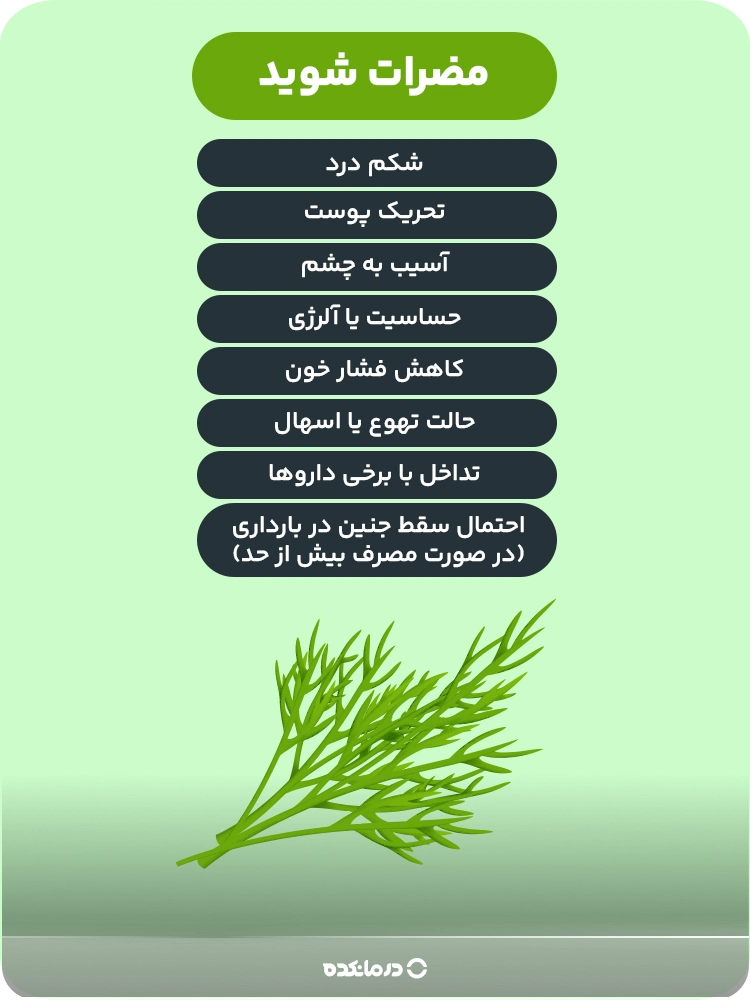 با وجود خواص بیشمار شوید برای سلامتی، مصرف بیش از حد آن مانند هر گیاه دیگری میتواند موجب بروز عوارض جانبی شود. مهمترین مضرات این گیاه شامل موارد زیر هستند: