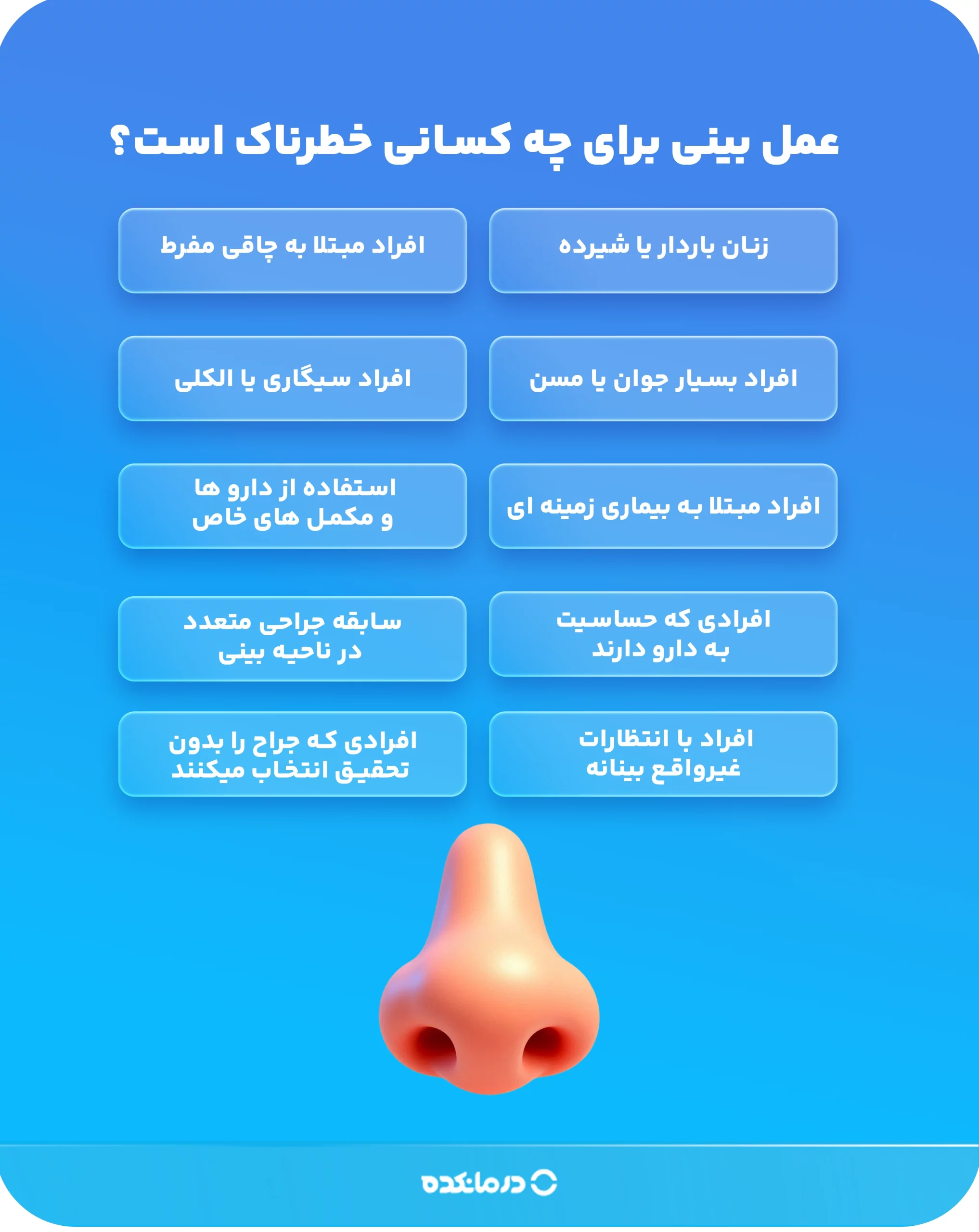 عمل بینی با وجود محبوبیت بالا، یک جراحی پیچیده است و برای همه افراد ایمن نیست. عواملی مانند بارداری یا شیردهی، سن بسیار کم یا بالا، بیماریهای زمینهای مانند دیابت و مشکلات قلبی، مصرف سیگار و استفاده از بعضی داروها میتوانند خطر عوارض را افزایش دهند. همچنین داشتن انتظارات غیر واقعبینانه ممکن است به نارضایتی ختم شود. به همین دلیل، مشاوره دقیق پیش از عمل برای ارزیابی شرایط جسمی و روانی اهمیت زیادی دارد.